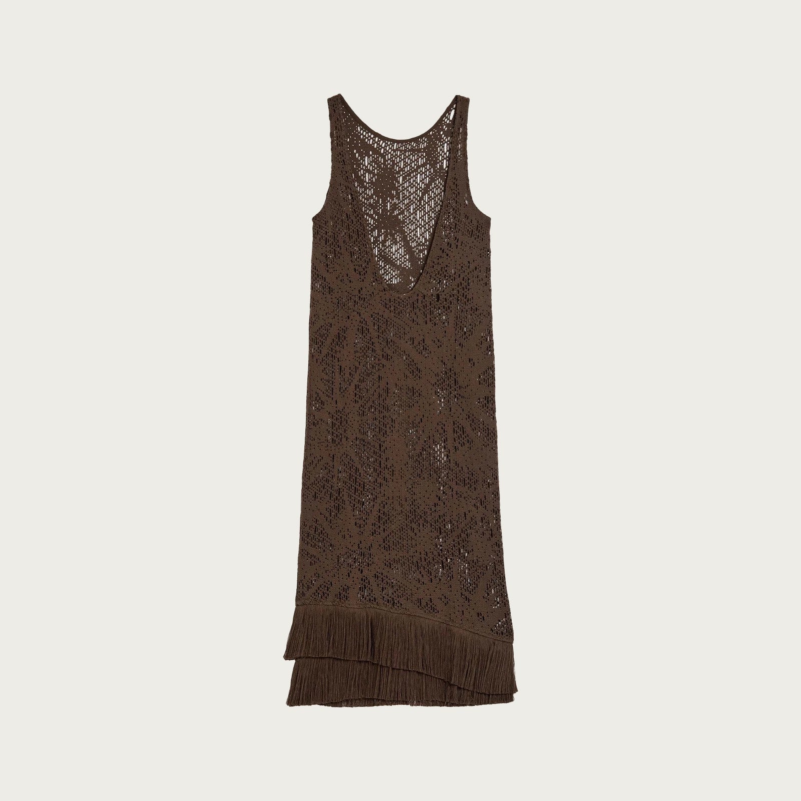 The Astrea Ari crochet dress lends comfort and ease on balmy days with a see-through crochet pattern that pays tribute to the blazing summer sun. Featuring a rounded neckline and a low-slung back, the midi silhouette falls to an asymmetric hem traced with soft fringing.