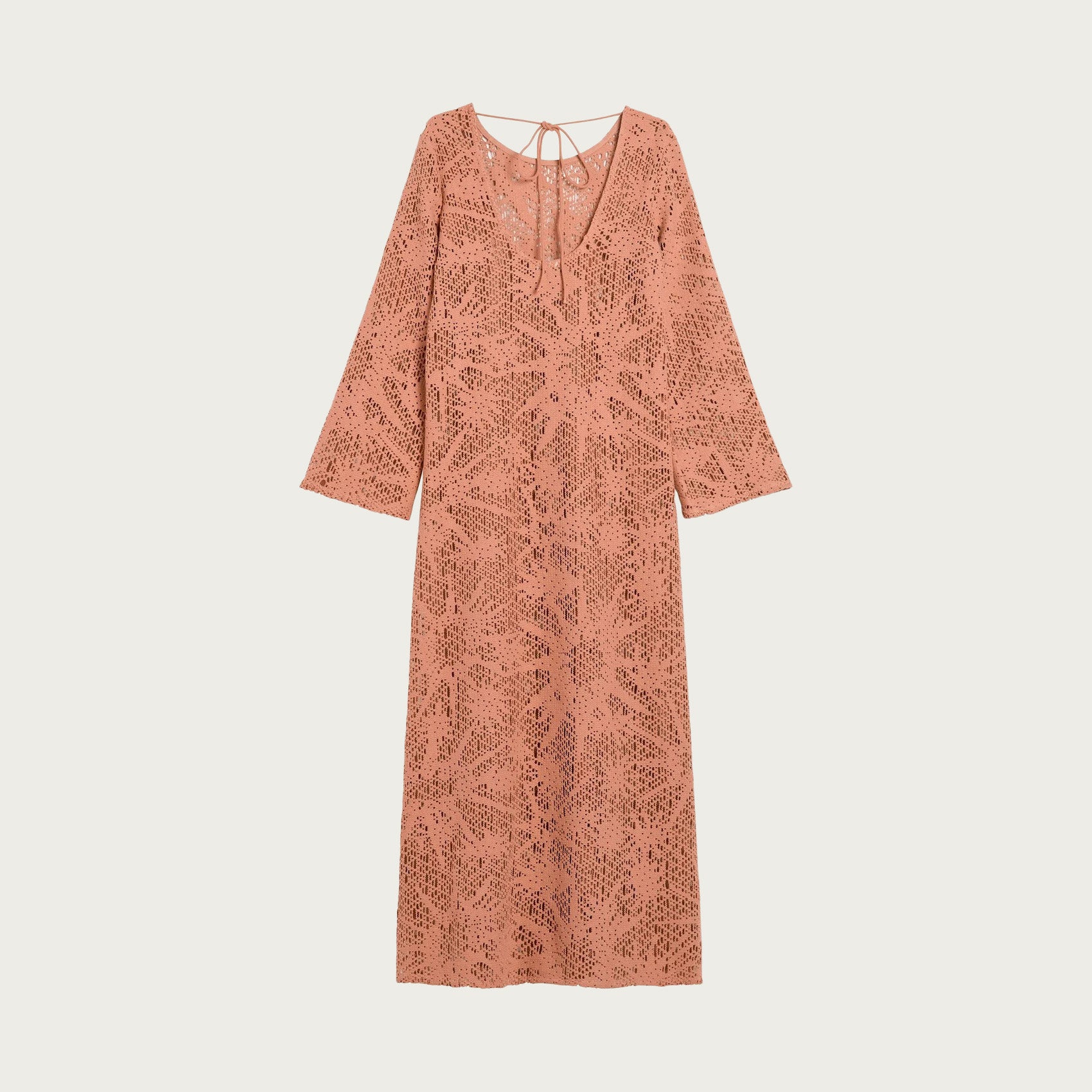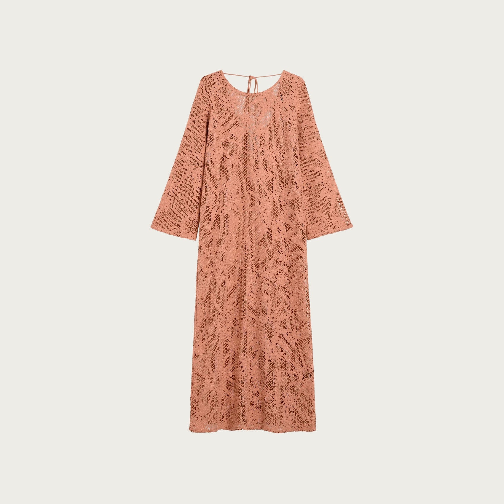 The Astrea Grace crochet dress features a see-through crochet pattern that echoes the warmth of the blazing summer sun. Trumpet sleeves and a scooped back with ties at the neck balances its ground-sweeping lengths; clashing Scandinavian sophistication with a free-spirited bohemian allure.