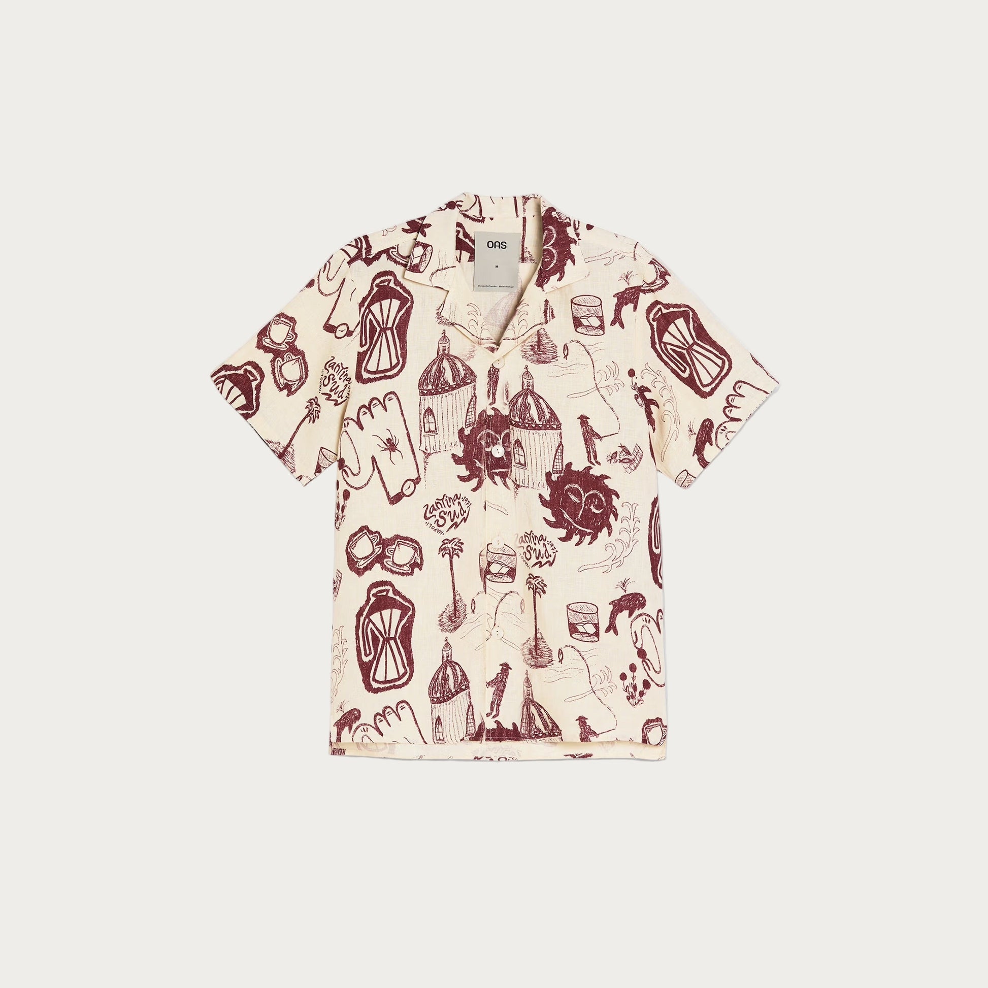 Printed linen shirt with burgundy scribbles on off-white base. Relaxed fit with resort collar, inspired by southern escapes.